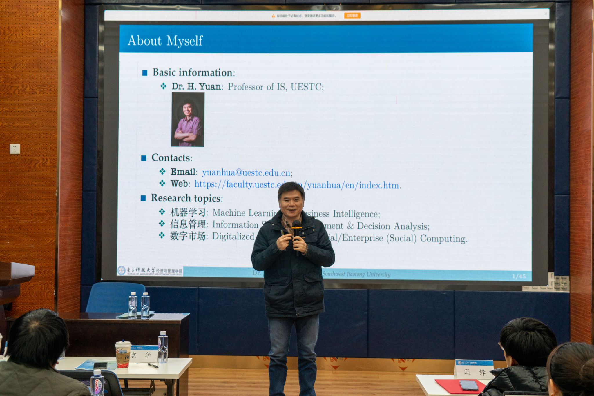 信息系统与运营管理系刘盾教授主持。他在对报告嘉宾的研究领域与学术成就进行简要介绍后,电子科技大学袁华教授受邀登台,作题为Harvesting Trade Partners Online from Massive Web with AI: A Joint Learning Method的精彩报告。报告直击中小企业(SMEs)在线搜寻商业伙伴时的管理困境,在通过搜索引擎在线寻找潜在商业伙伴时,面临的数据分散、交互繁琐、检索效率低下等现实难题。