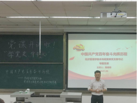 本科经贸类党支部于6月23日在J4107教室举办了 “学党史、守初心之中国共产党百年奋斗光辉历程”—本科经贸类党支部党史学习教育党支部书记专题党课,由党支部书记陈建奇主讲,支部的全体党员、预备党员、积极分子共计100多人参加了专题学习会议。