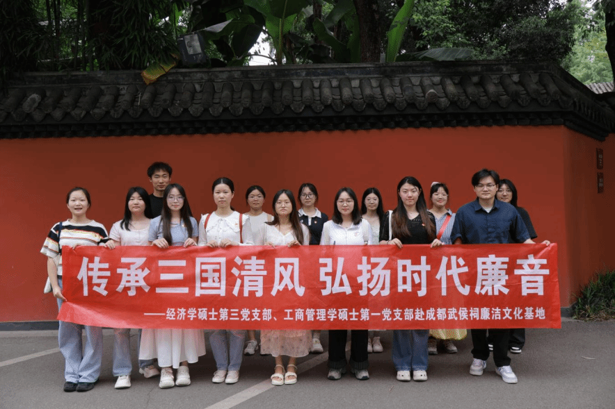 经济学硕士第三党支部联合工商管理学硕士第一党支部前往成都武侯祠廉洁文化基地开展“传承三国清风 弘扬时代廉音”主题教育实践活动。通过实地参观学习、聆听廉洁文化讲解,深刻感悟诸葛亮等历史名臣清正廉明、忠贞报国的精神品格。
