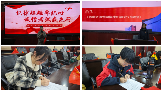 2025年12月24日,党支部组织开展“纪律规矩牢记心,诚信考试我先行”诚信考试教育主题党日活动。支委带领支部全体成员学习《西南交通大学本科生考试违规处理办法》等制度文件,结合典型案例开展警示教育。随后,全体成员郑重签订《诚信考试承诺书》,承诺自觉遵守考纪、抵制舞弊,并带动身边同学共同维护公平诚信的考试环境。