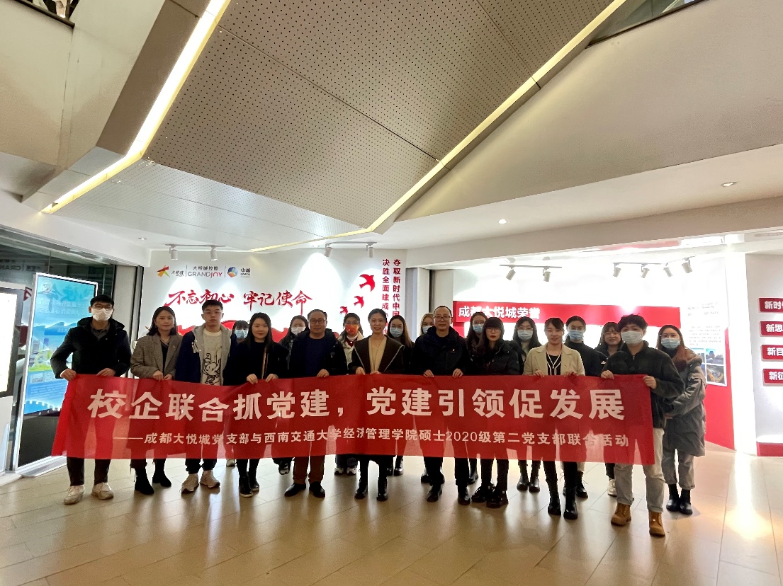 为学习贯彻党的十九届六中全会精神,全面开展党建活动,加强思想政治建设与实践。2021年12月15日下午,西南交通大学经理管理学院硕士2020级第二党支部在党委副书记杨宏毅、副院长李良以及支部书记贾佳老师和研究生辅导员陈海波老师的带领下,至成都大悦城公司开展“校企联合抓党建,党建引领促发展...