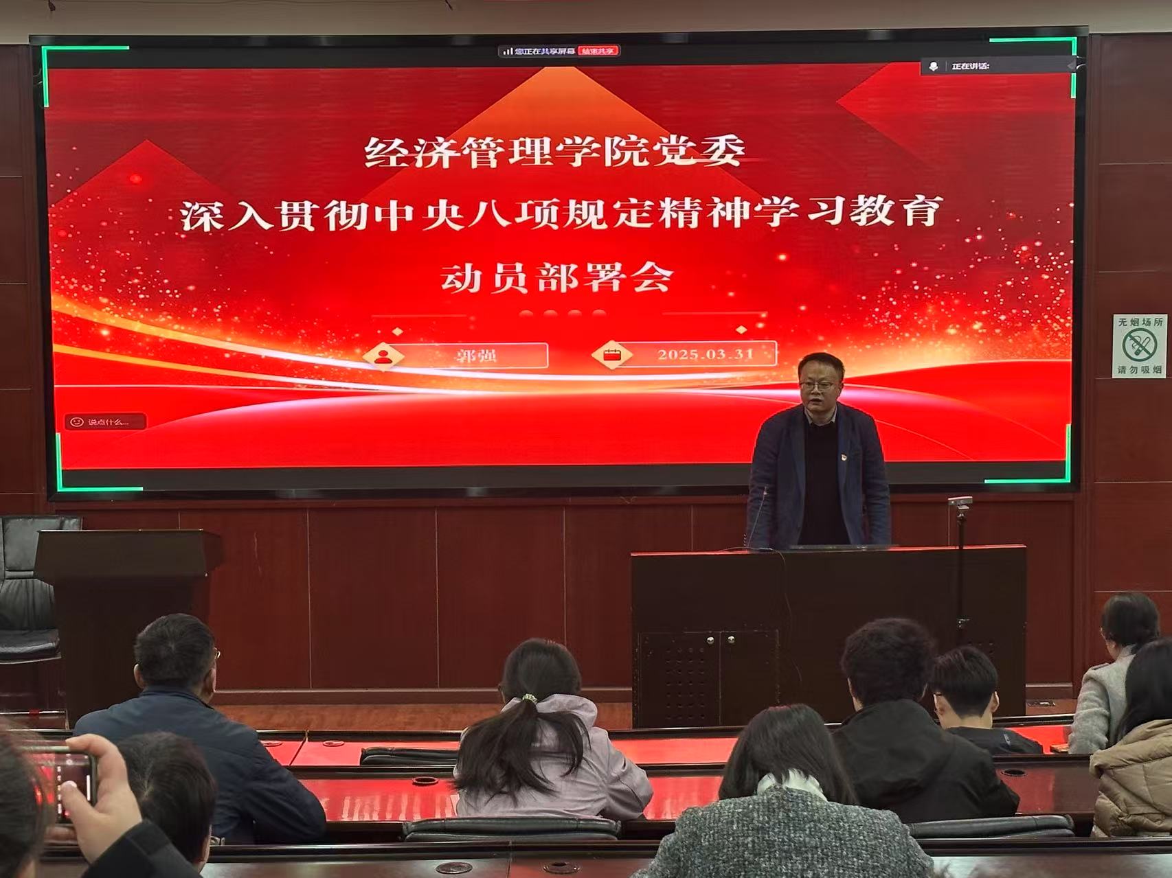 2025年4月22日,学院党委在0218教室召开深入贯彻中央八项规定精神学习教育阶段性工作布置会,学院党委书记郭强、副书记余小英、党委组织员以及师生党支部书记30余人参加了会议。