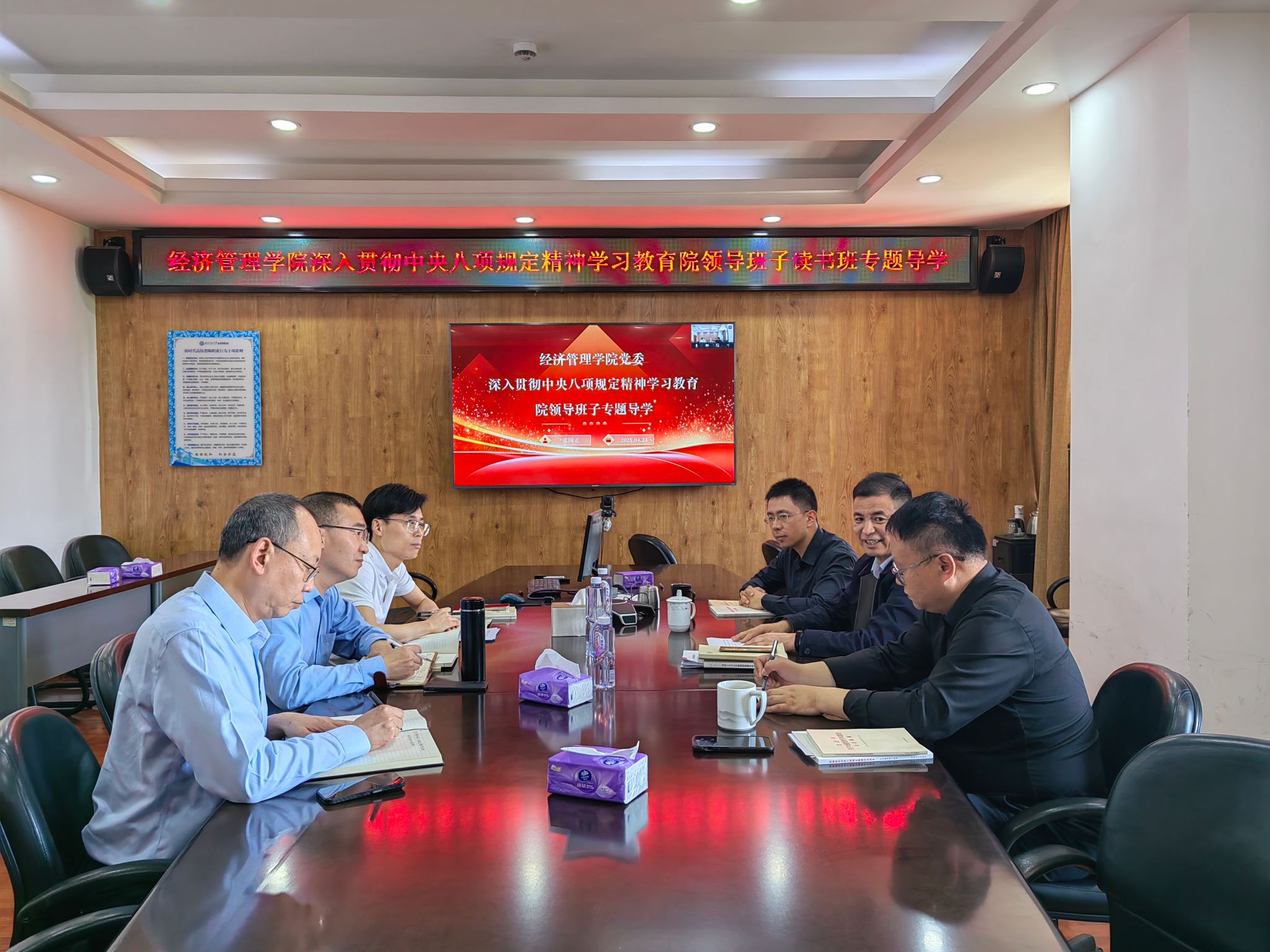 4月24日,学院领导班子在0607会议室开展深入贯彻中央八项规定精神学习教育专题读书班学习。