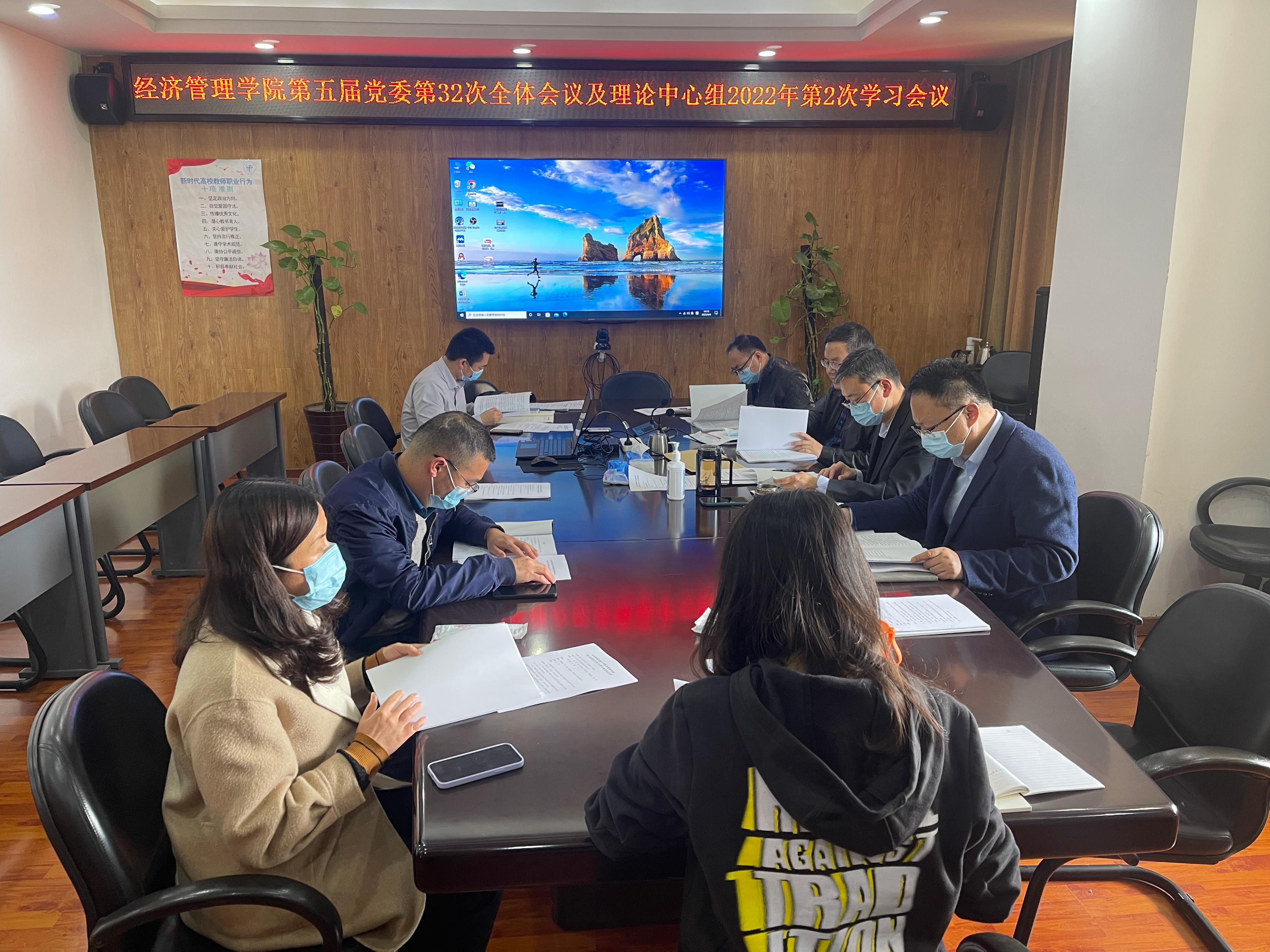 2022年4月6日下午2:00,学院第五届党委2022年第2次理论学习中心组学习、第32次全体会议在九里校区零号楼0607会议室召开。会议由学院党委书记王斌主持。在党委理论学习中心组学习中,与会人员认真学习了全国“两会”精神以及《习近平:不断巩固中华民族共同体思想基础 共同建设伟大祖国共同创造美...