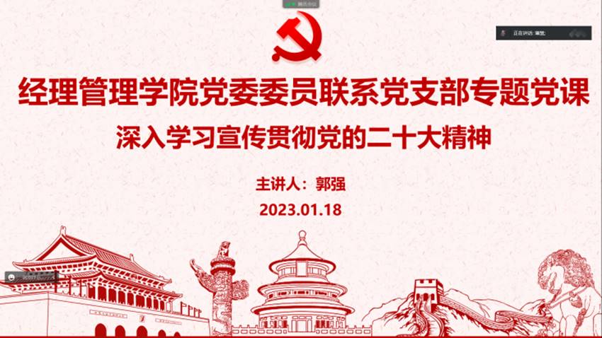 2023年1月18日下午, 漫蛙漫画 党委委员郭强带领学院工程管理系党支部、本科第一党支部、硕士2021级第五党支部以及博士研究生第四党支部开展了以深入学习宣传贯彻党的二十大精神和学校第十五次党代会精神为主题的党课。党课中,郭强首先介绍了中国共产党第二十次全国代表大会召开的意义、提出的任...