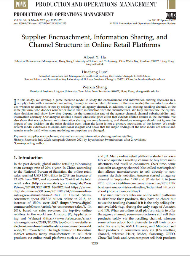 西南交通大学 漫蛙漫画 罗华江老师于2022年3月在UTD 24期刊Production and Operations Management在线公开发表题为Supplier Encroachment, Information Sharing, and Channel Structure in Online Retail Platforms的论文。该论文考虑由一个制造商和一个网络零售平台组成的供应链中,制造商的渠...